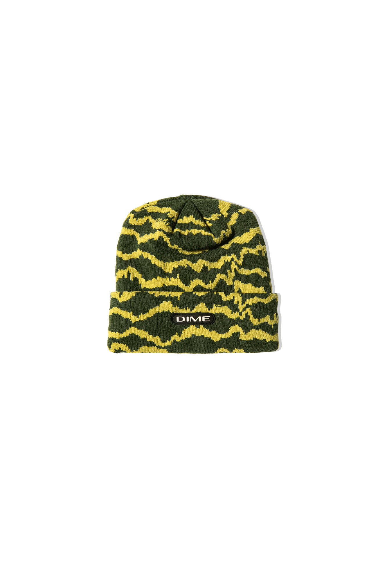 This yellow and green beanie features an abstract pattern with horizontal irregular lines and a label tied on the front. Dime is a Canadian skate brand founded by Phil Lavoie, Vince Tsang, and Antoine Asselin. When it was initially created in 1994, it went by the name ‘Dimestore’ as a tribute to Lou Reed’s ‘Dime Store Mystery’. Over the years, it became one of the most exciting streetwear labels out there. The crew’s rebellious, non-conformist spirit is always present in the brand’s designs.
