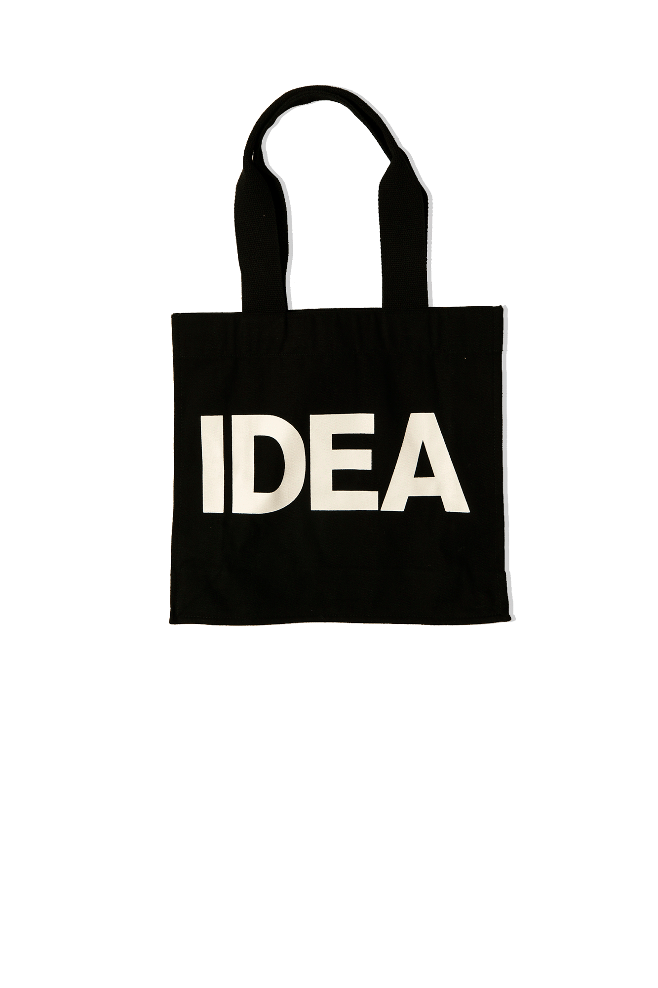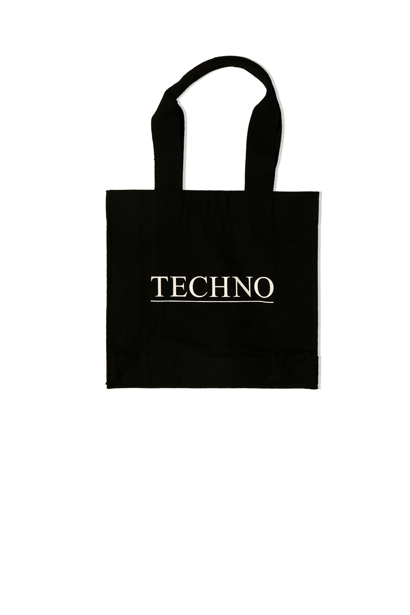 IDEA’s tote bag is made from durable black canvas and features two partially folded top handles for comfortable carrying. It’s printed with ‘TECHNO’ in white letters on one side and the brand’s name on the other.