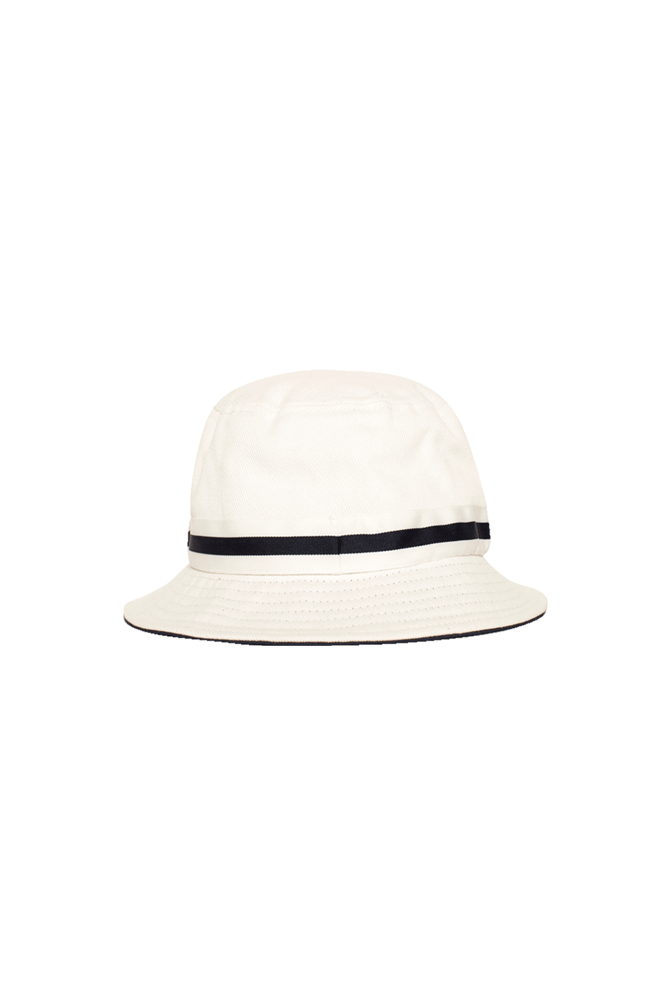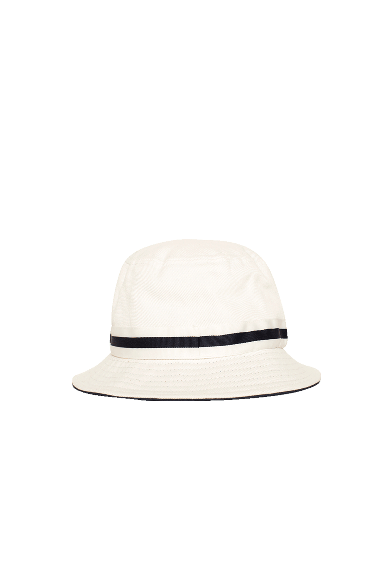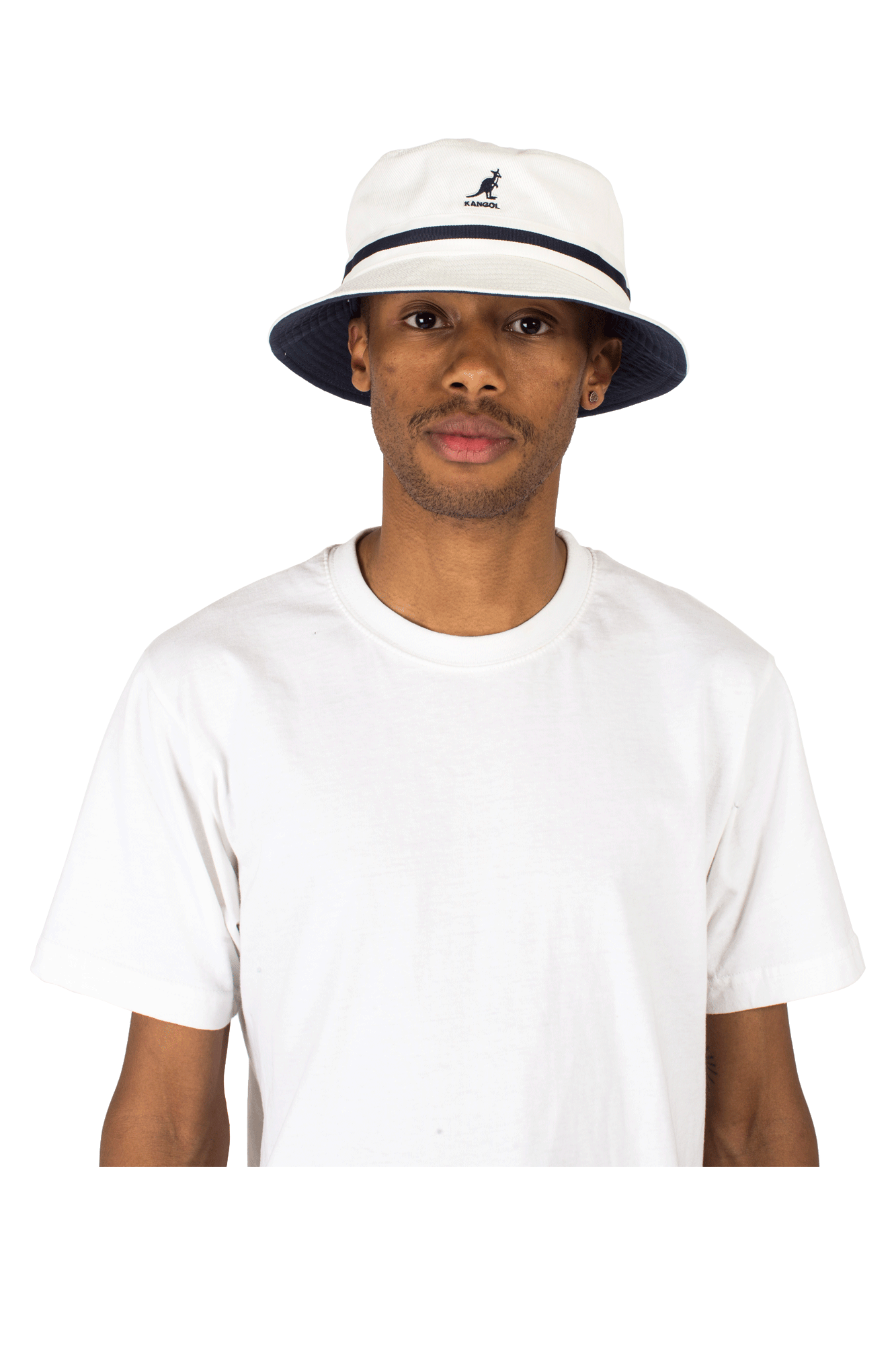 This white bucket hat features a blue fabric stripe near the visor and the iconic kangaroo logo embroidered on the front.