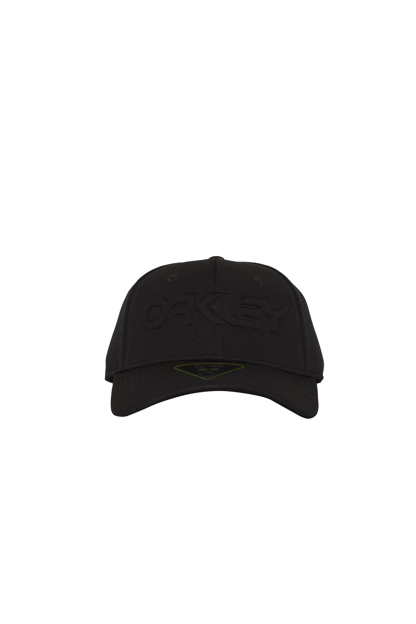 This black hat has the logo of the brand embossed on the front and the word “OAKLEY” embroidered in yellow on the back.