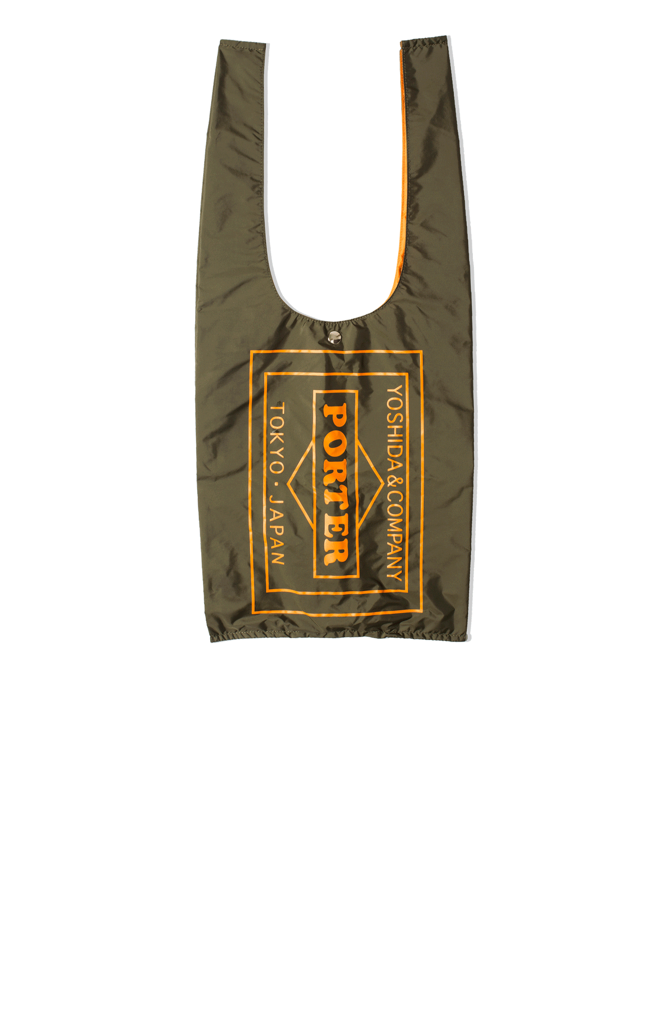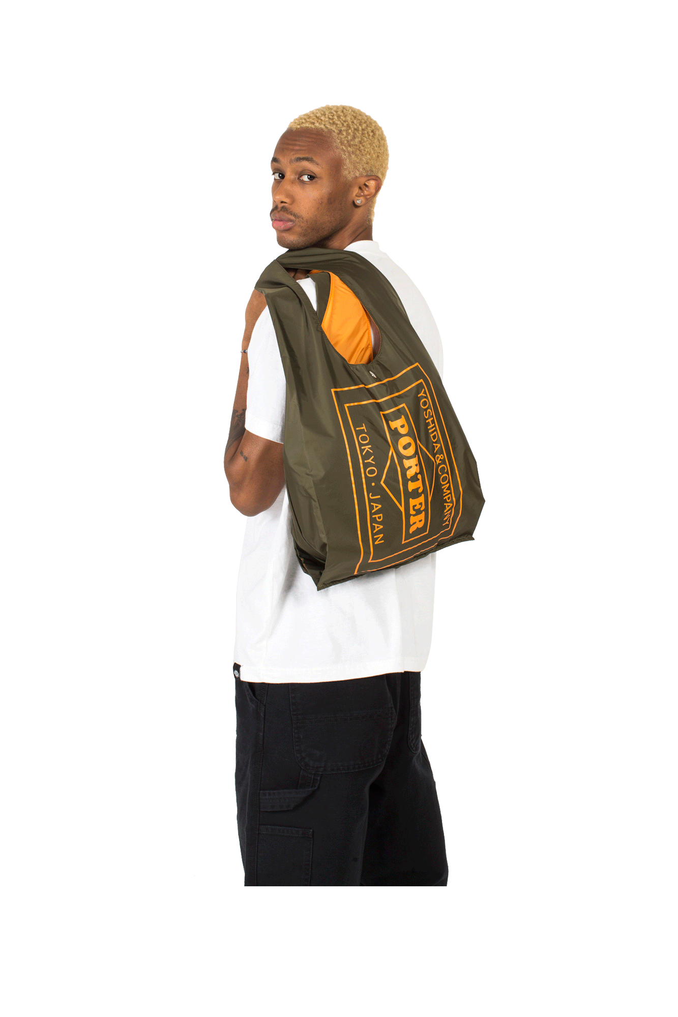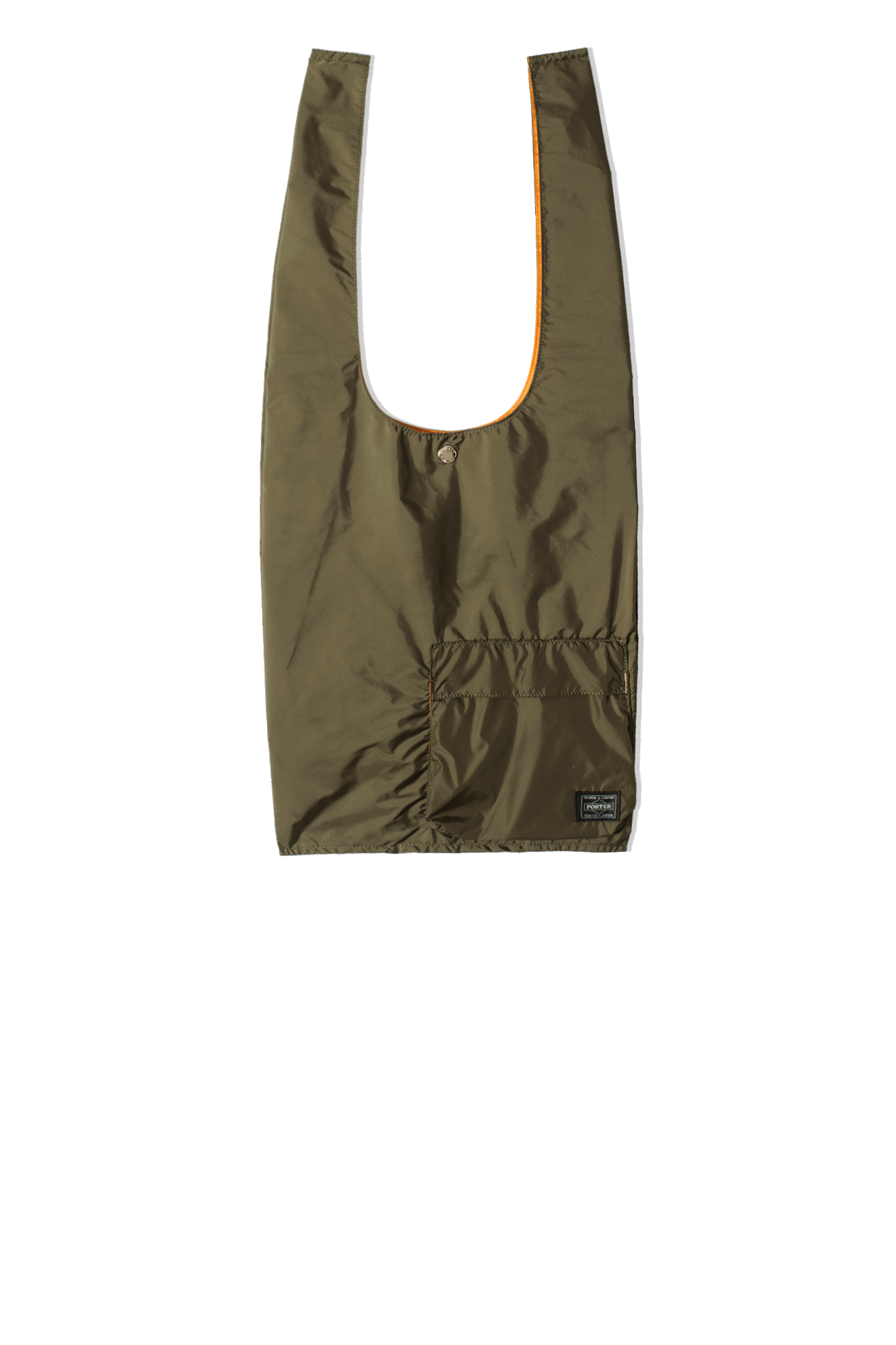 This Khaki grocery bag features a classic tote design, it features a branded snap button closure at the top, an external pocket with snap button closure and a branded label. On the back an orange logoed graphic. The bag also comes with an orange envelope that holds the bag for easy carrying and packing. A Japanese classic, the accessories by Porter-Yoshida & Co stand out for their aesthetics and quality: in fact the timeless design and functionality of each product blend perfectly with the “Made in Japan” production, characterized, in this case, by the use of nylon, which guarantees its impermeability.