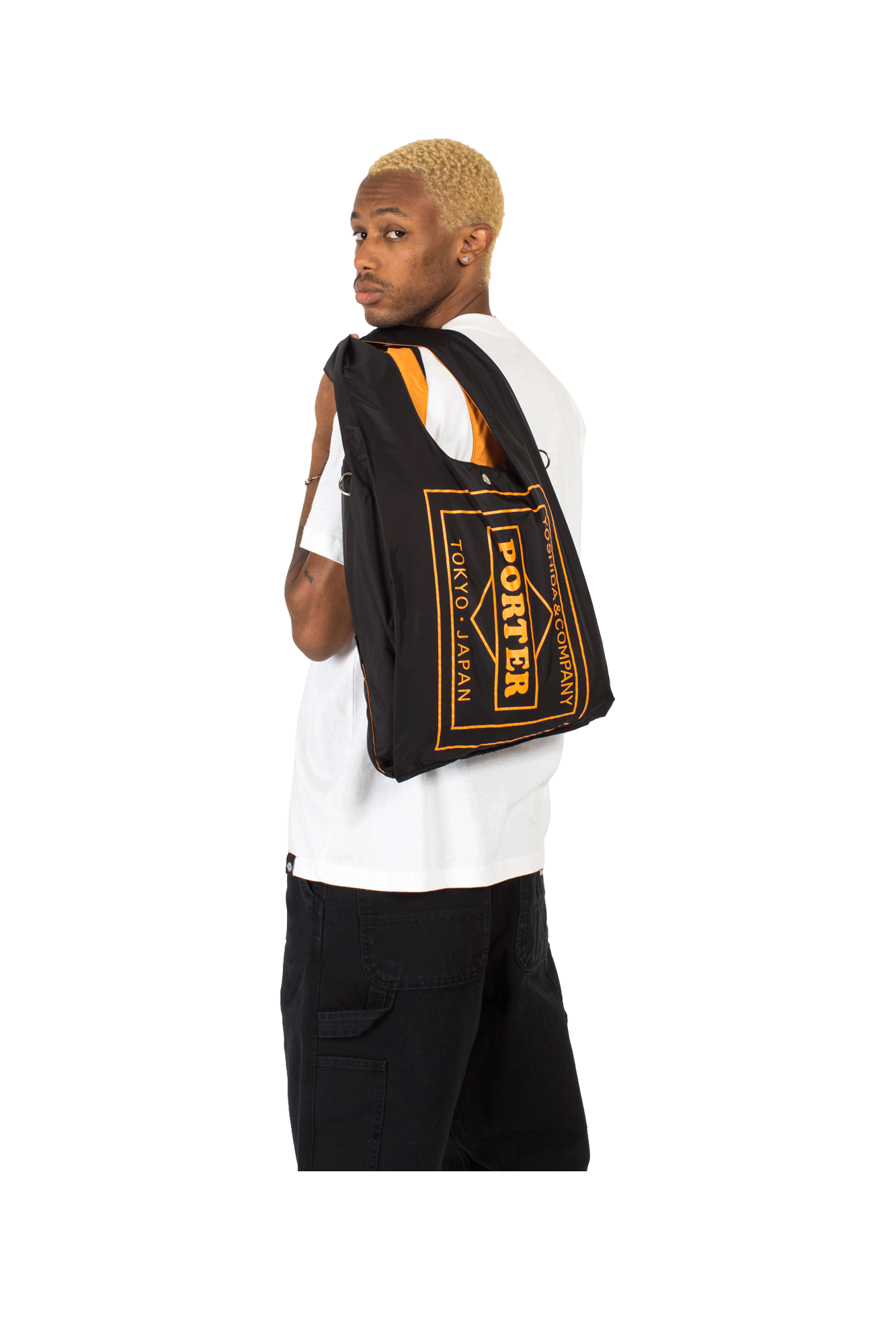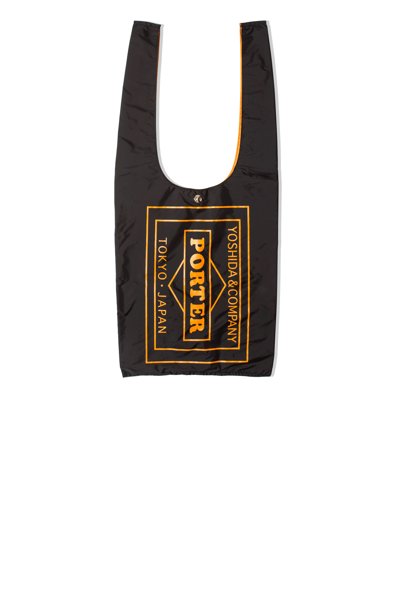 This black grocery bag features a classic tote design, it features a branded snap button closure at the top, an external pocket with snap button closure and a branded label. On the back an orange logoed graphic. The bag also comes with an orange envelope that holds the bag for easy carrying and packing. A Japanese classic, the accessories by Porter-Yoshida & Co stand out for their aesthetics and quality: in fact the timeless design and functionality of each product blend perfectly with the “Made in Japan” production, characterized, in this case, by the use of nylon, which guarantees its impermeability.