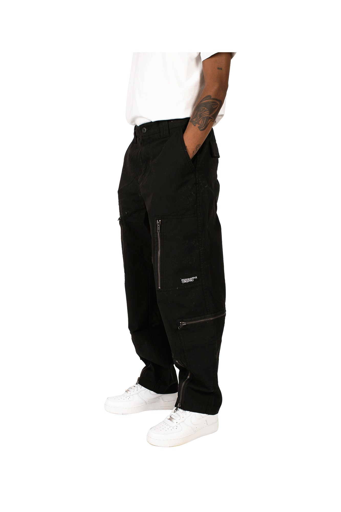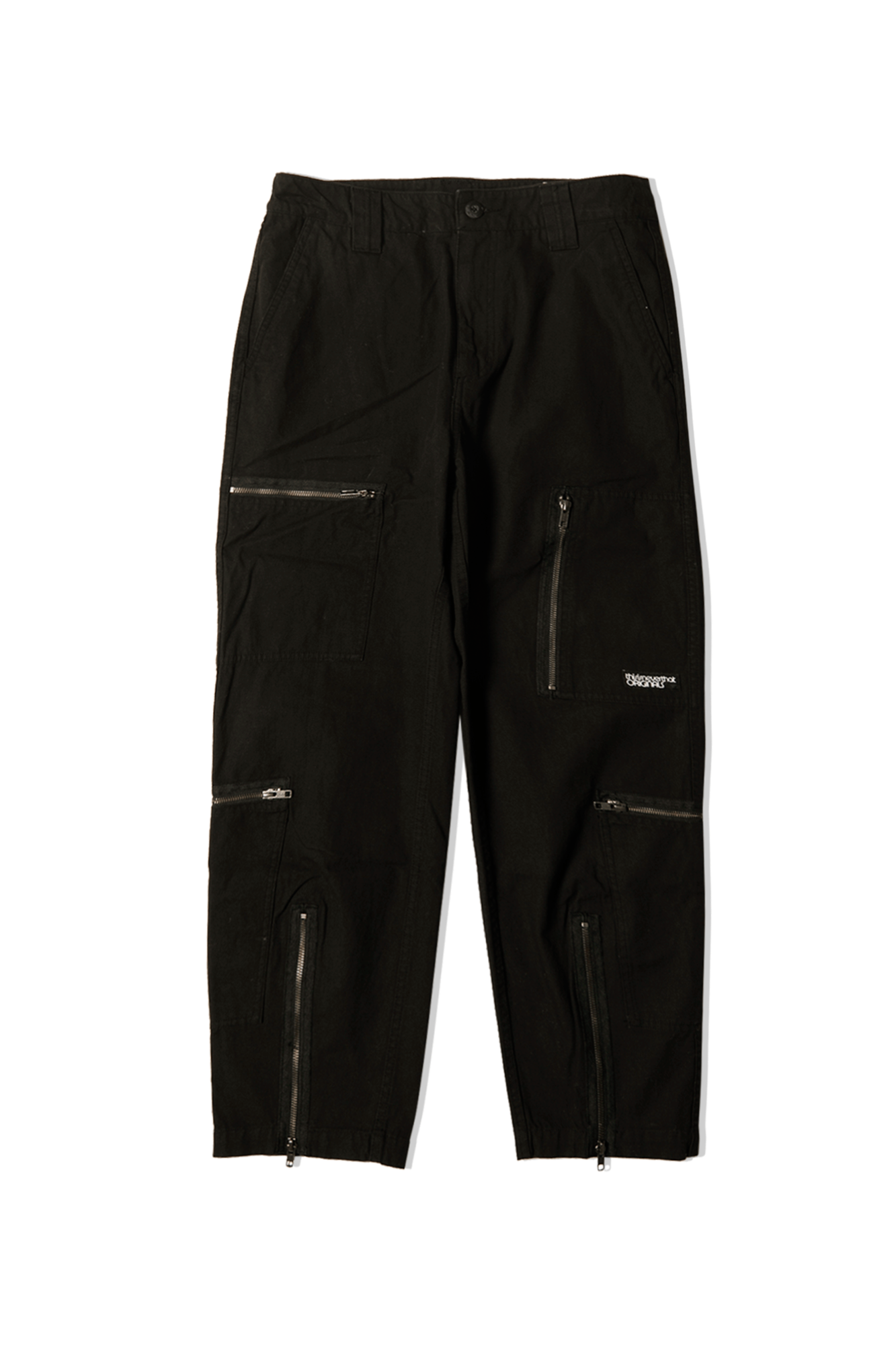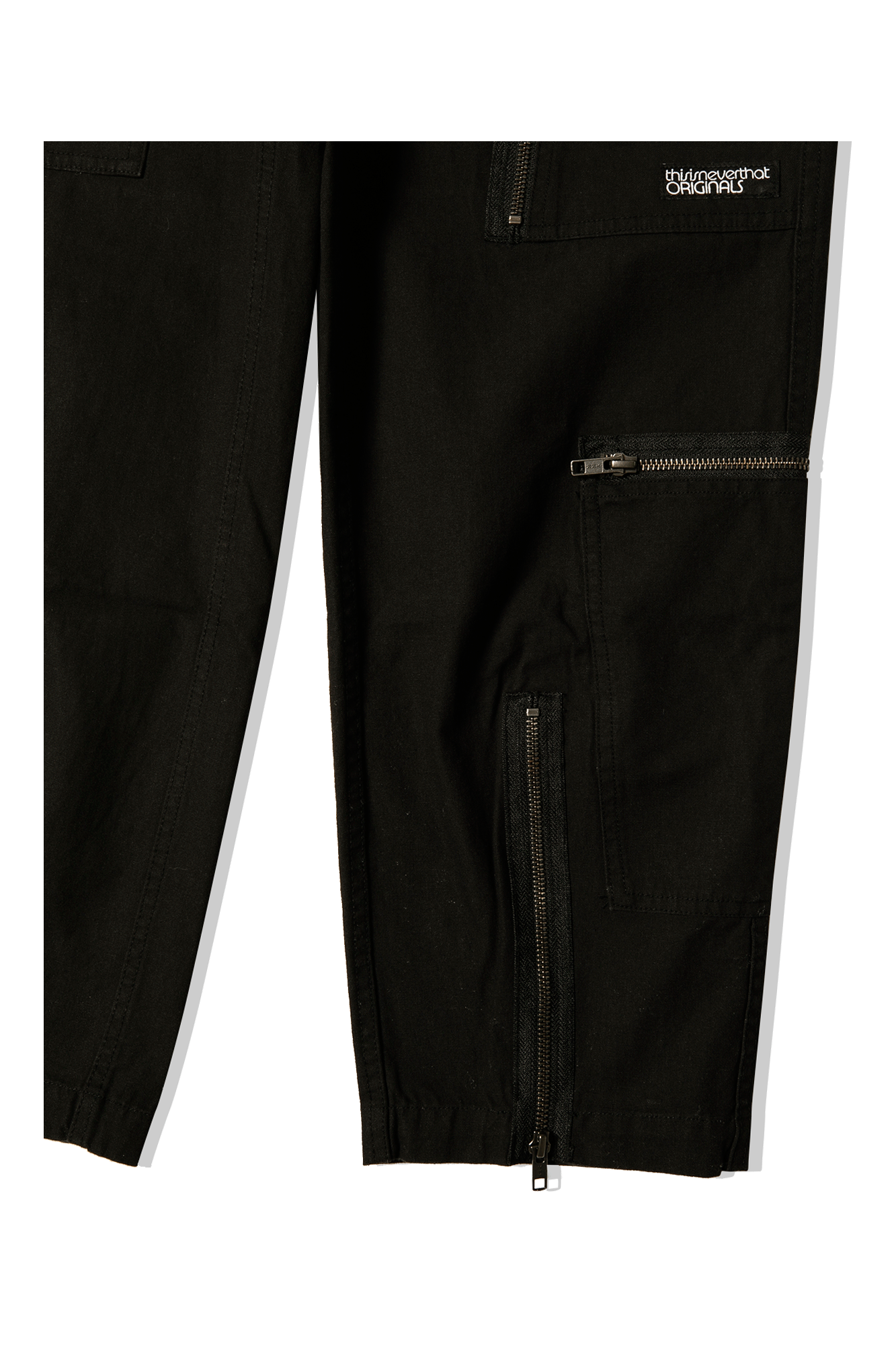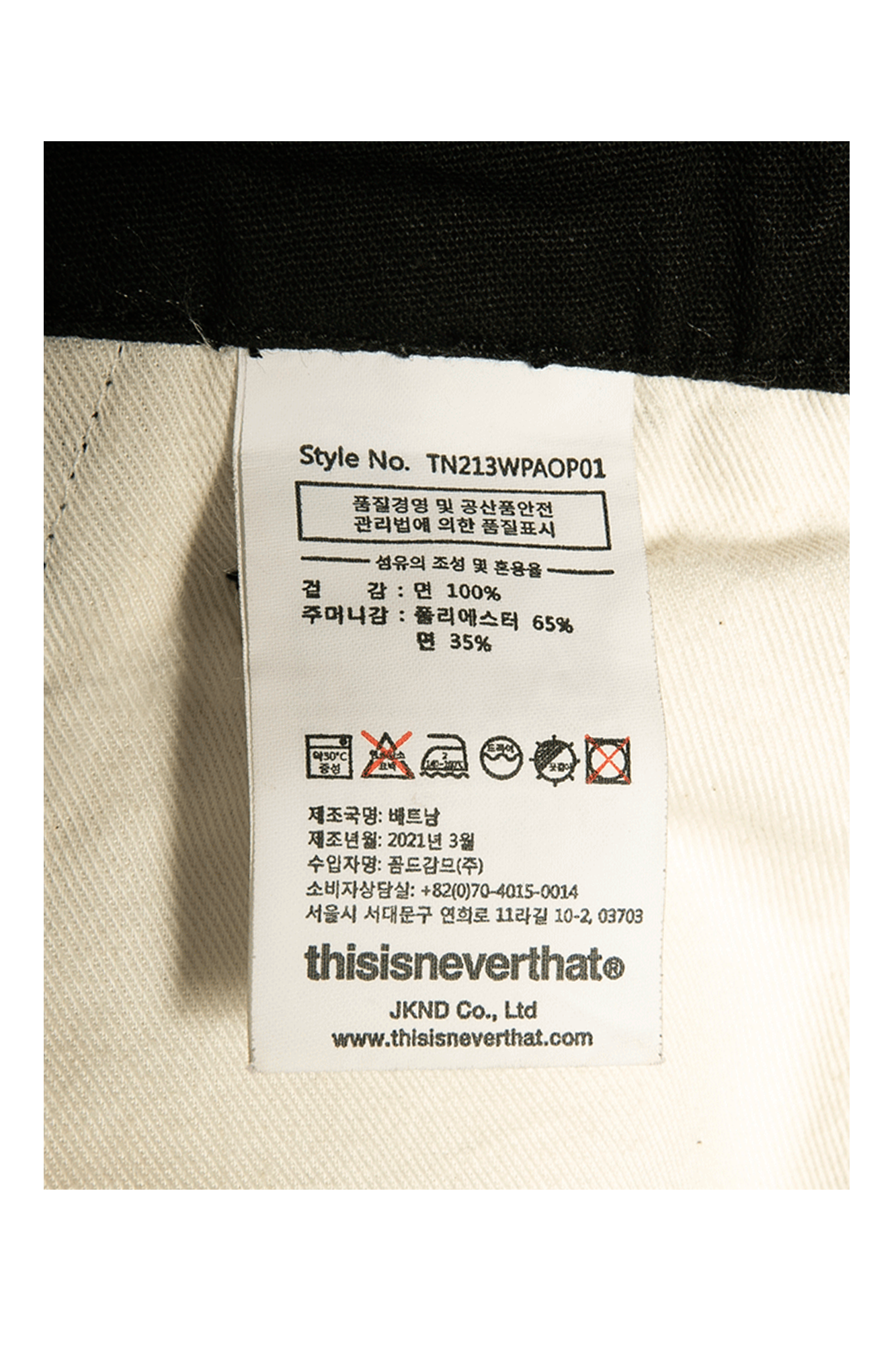 These black cargo pants have an over fit, two back patch pockets two and six front pockets, two side and four on the legs with zip closures, the pocket on the left thigh has a label tied thisisneverthat original and frontally at ankle height there are other two hinges. Launched in 2010 and worn by both the mainstream and the underground Asian musical scene, it has become one of the most influential brands in Asia, basing its style on heavy graphics and texts.